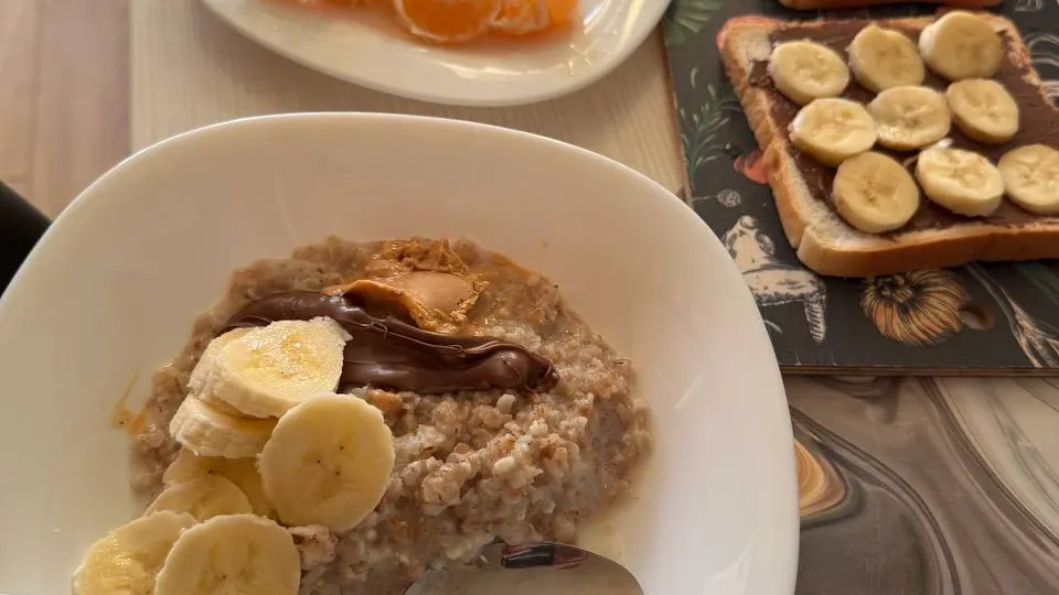 Какой завтрак чемпионки? Часто это авокадо, яйца, овощи, ложка кокосовой пасты. У сына чемпионки — овсянка, яйца с сосисками, тосты из белого хлеба — мне нельзя, я ем гречневые хлебцы. Иногда у меня каша с арахисовой и шоколадной пастой, банан — чтобы калорий было достаточно и сил хватало.