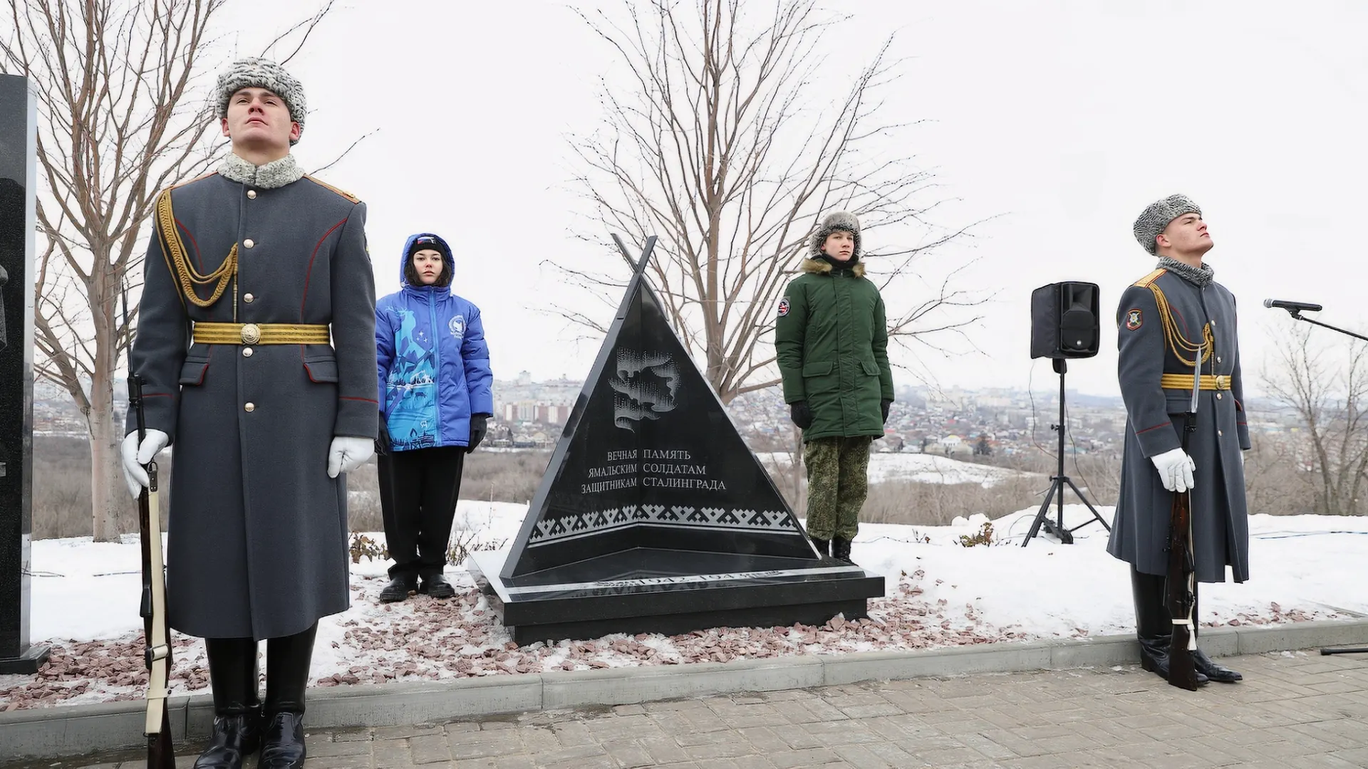 Памятник героям Ямала установили на Мамаевом кургане. Это стало возможным благодаря инициативе поисковых отрядов и гранту губернатора региона. На открытие впервые в истории подобных мероприятий привезли 20 школьников.