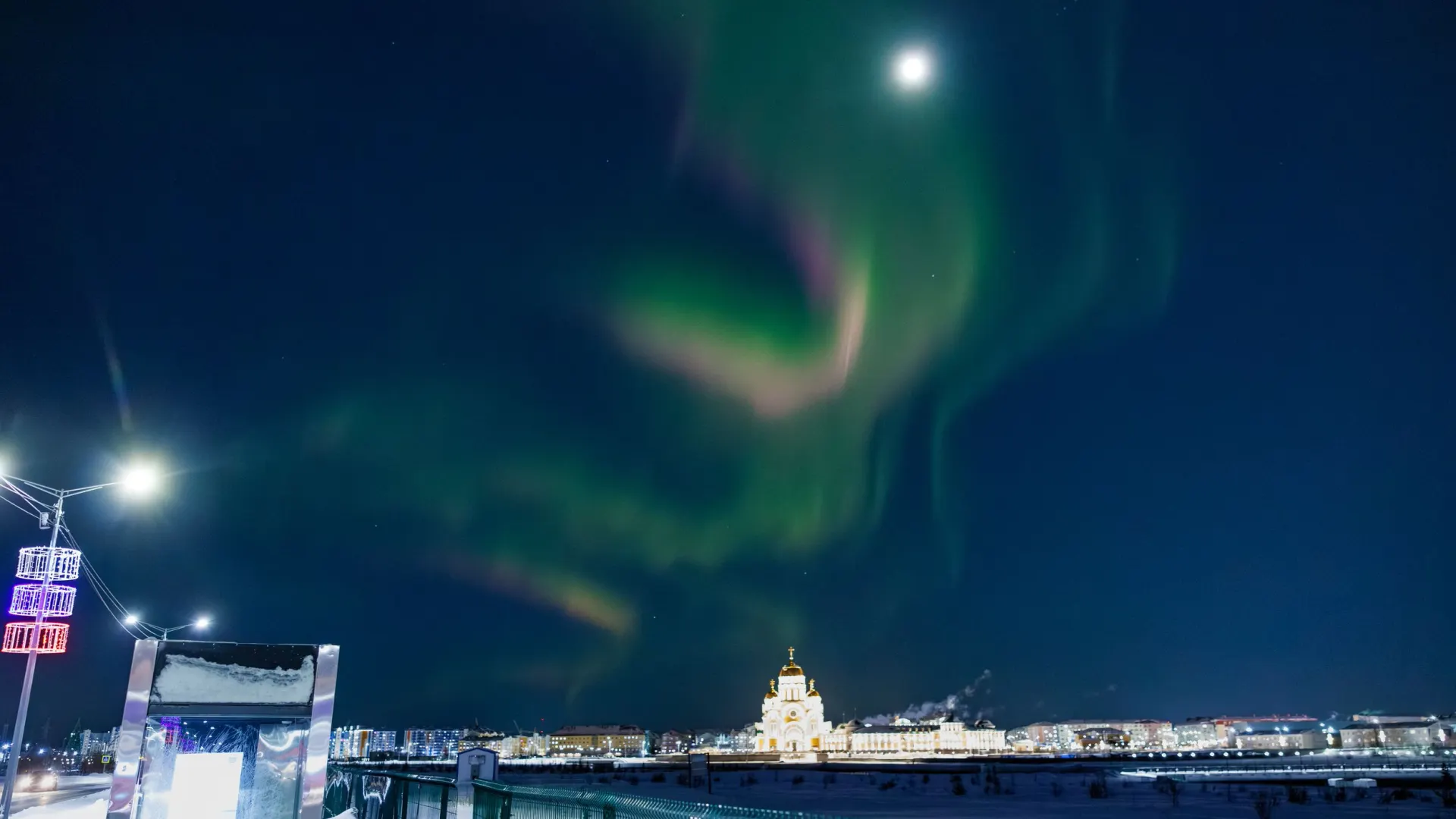 «Сейчас сияние яркое — 84%. Можно выехать за город, чтобы оно отчетливо виднелось», — написали в посте telegram-канала «Туризм на Ямале».