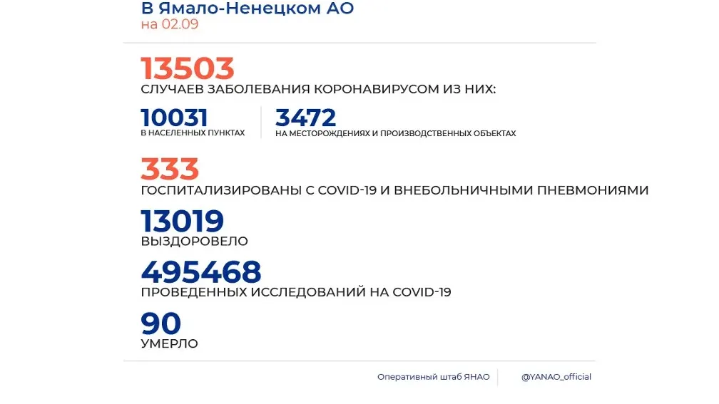 На Ямале на 2 сентября 2020 года зарегистрировано 46 новых случаев заболевания COVID-19 (за весь период – 13 503). Выздоровели 16 человек (за весь период – 13 019). Госпитализировано 214 пациентов с COVID-19 (из общего числа болеющих), 7 пациентов – в тяжелом состоянии (из общего числа госпитализированных), 2 – в крайне тяжелом (из общего числа госпитализированных), 5 пациентов – на ИВЛ (из общего числа тяжелых больных).